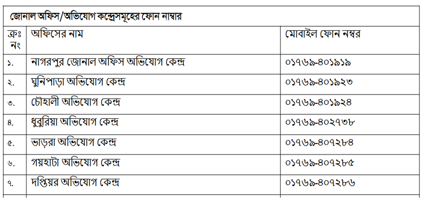 | 1. | নাগরপুর জোনাল অফিস অভিযোগ কেন্দ্র | ০১৭৬৯-৪০১৯১৯ |